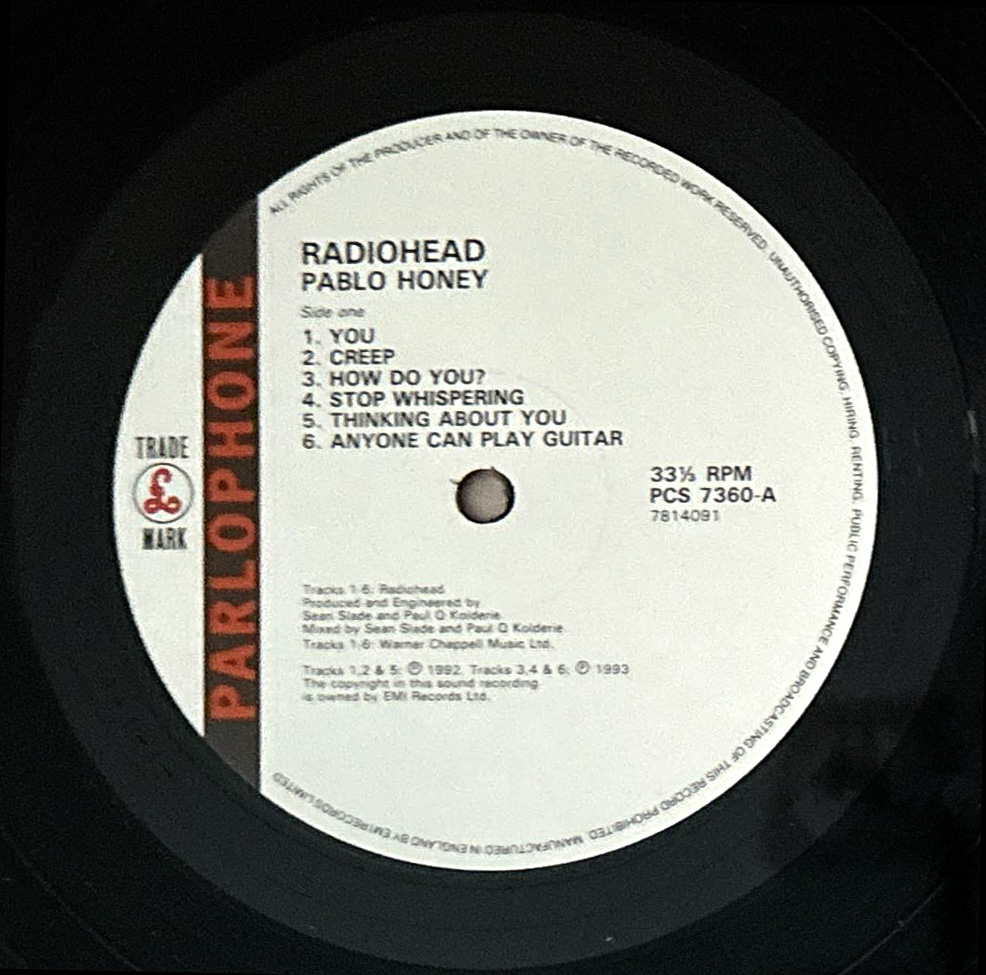 Rare original 1993 UK Parlophone label 12-track LP - the 1st Pressing of British rock bands debut album - recorded in three weeks at Chipping Norton Recording Studios in Oxfordshire in 1992 with Fort Apache Studio, Boston,  production duo Sean Slade and Paul Q. Kolderie  - known from their work with Dinosaur Jr. and Pixies - behind the mixing console along with Radiohead's co-manager Chris Hufford. The album features the singles Creep, Anyone Can Play Guitar and Stop Whispering.